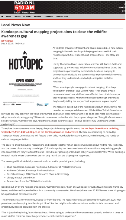 The Wawanesa grant has already strengthened the collaboration between the Community and Cultural Mapping Research Group and TRU’s Institute for Wildfire Science, Resiliency, and Adaptation, creating a unique synergy where scientific understanding of wildfire behavior and risk assessment combines with cultural mapping’s community engagement capabilities to produce holistic preparedness strategies. This partnership positions TRU to lead the kind of community coalition development required to support local and regional development of a community-centered, culturally informed disaster response infrastructure. Ongoing updates and presentations will be documented on the research website, culminating in spring 2026 with a comprehensive exhibition and research symposium that will synthesize and share the project’s findings.